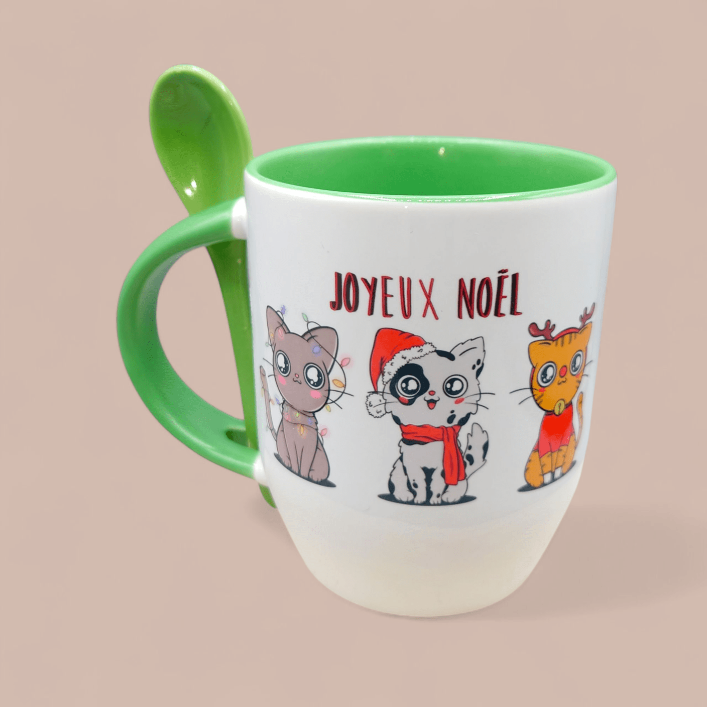 Vous cherchez une idée cadeau originale, utile et mignonne ? Le Mug cuillère chatons de Noël vert est le choix idéal !