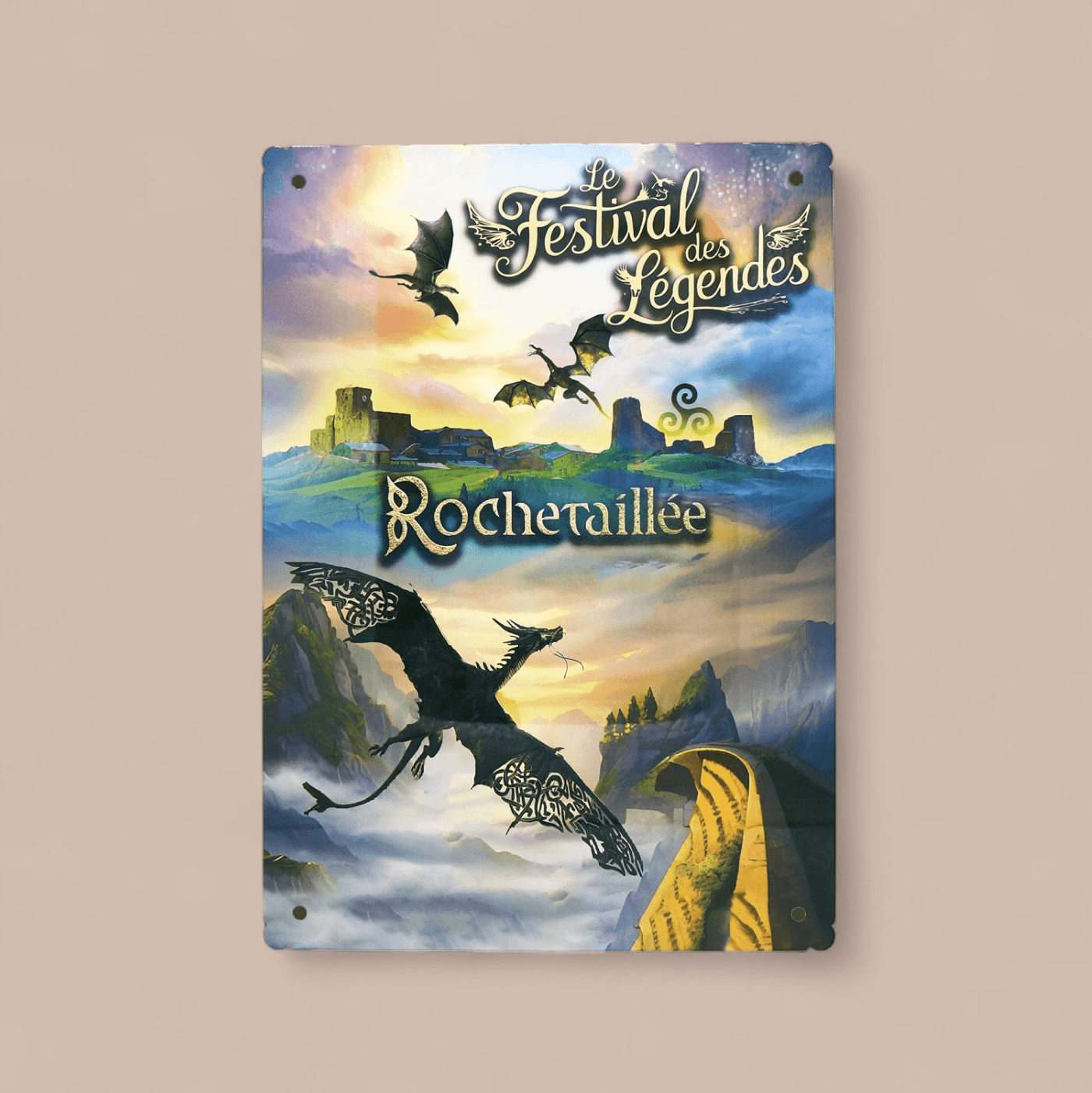 Plongez dans l’univers magique du Festival des Légendes à Rochetaillée avec cette plaque décorative unique, mettant en scène le village pittoresque de Rochetaillée et le majestueux barrage du Gouffre d’Enfer, protégé par des dragons.